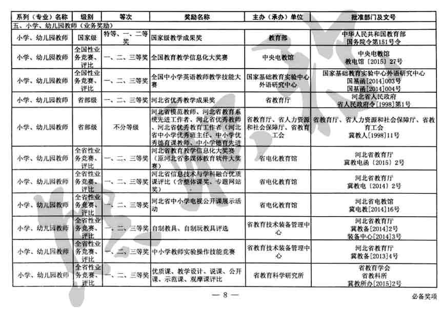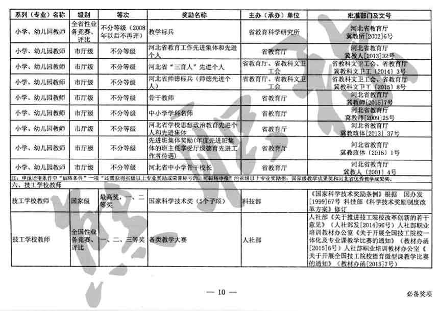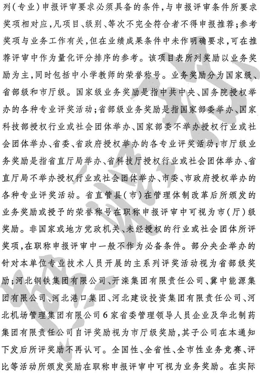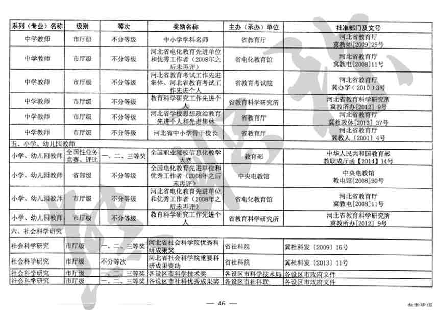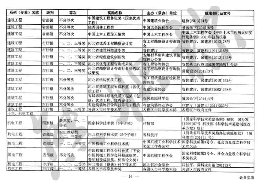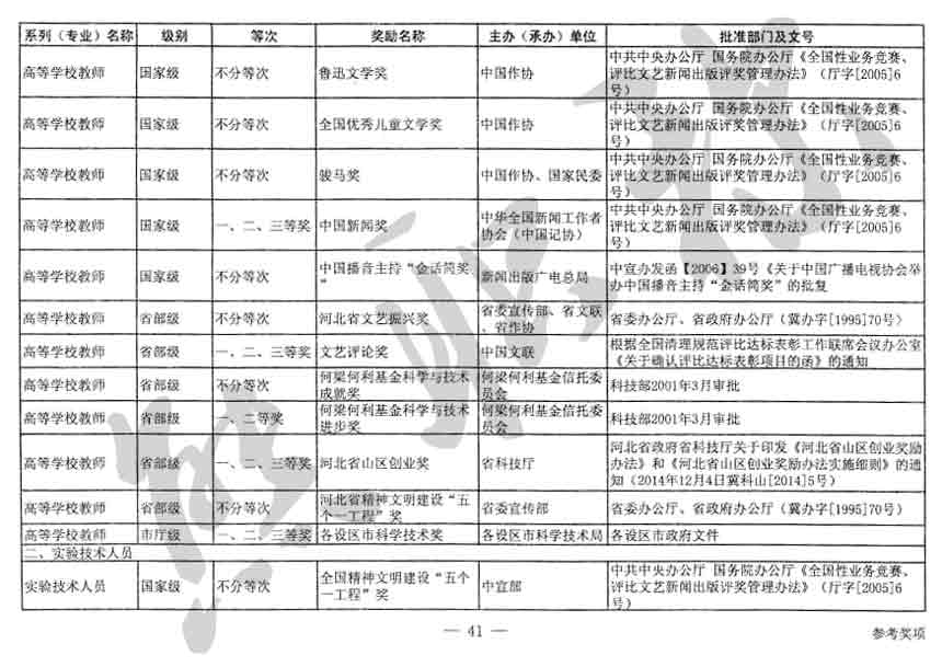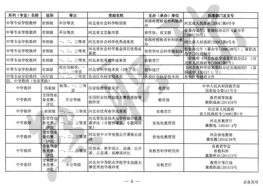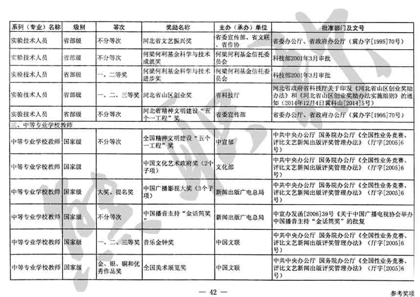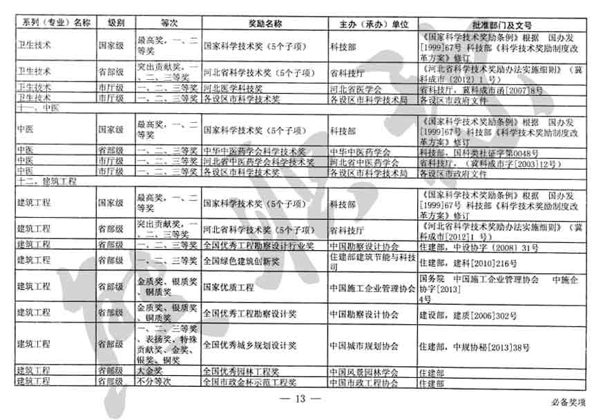職稱評審業績成果中包含職稱評審獎項,那么究竟什么是職稱評審獎項,具體各個專業的河北職稱評審獎項劃分是怎么來的,熊老師今天就把咱們河北省公布過的職稱評審獎勵給您發一下,人才辦理職稱的時候可以有一個參考,建議收藏,這是一整份, ………