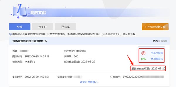 不過,您要注意,其中會有一條提示:本系統不會收錄您提交的文獻。訂單支付完成后,系統將為您保留檢測報告30天(不含支付當天),請及時下載。